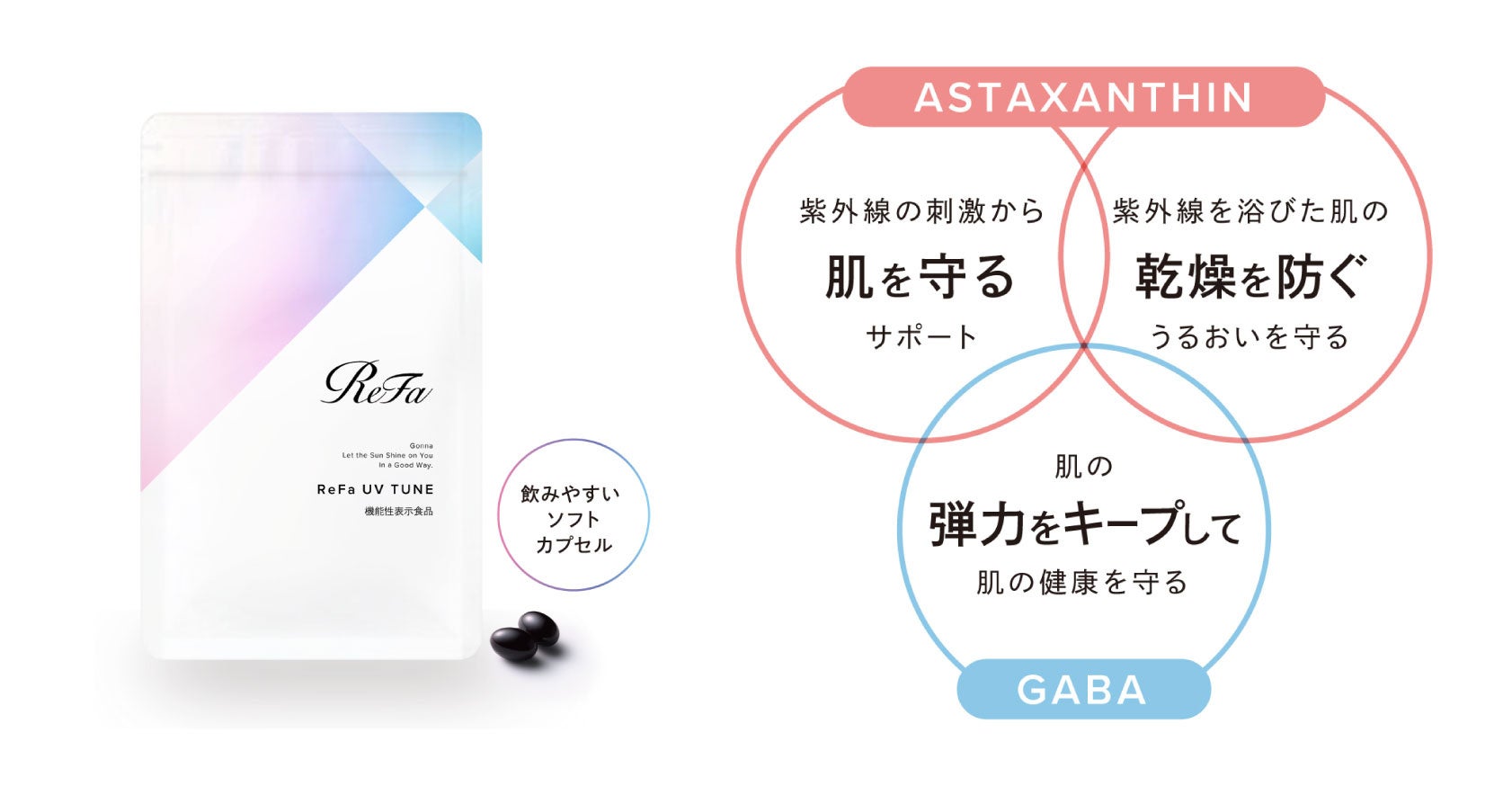 紫外線ケアの落とし穴“UVリーク”に着目して作られた「ReFa UV TUNE」は、 「紫外線・乾燥・弾力」の3つのケアを1つで実現し、全身の肌を内側から守る、機能性表示食品です。