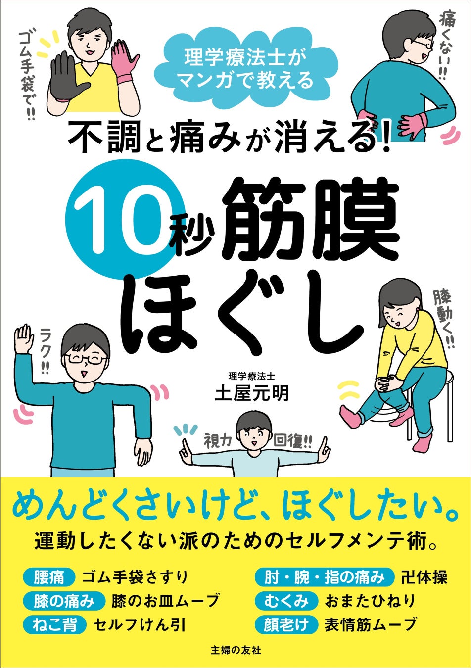 コロナ禍ですっかりインドア派になり、肩こりや腰痛、ひざ痛、眼精疲労などに悩まされるようになった人、必見! 『理学療法士がマンガで教える 不調と痛みが消える 10秒筋膜ほぐし』(土屋元明・著、こしいみほ・マンガ)は、「ゴム手袋ほぐし」「膝のお皿ムーブ」など、超ラクちんに全身のこりや痛みを即時にほぐすメソッドを、大人気の理学療法士がマンガでレクチャーする書籍。 インドア趣味にハマった人、リモートワークになった人、スマホやPCを1日中見ている人のガチガチの肩・腰・背中・腕のコリや痛みを、筋膜を効率的にほぐすことで解消。人気漫画家・こしいみほさんのわかりやすいコミックで、ケア法も理論もわかりやすく学べます。