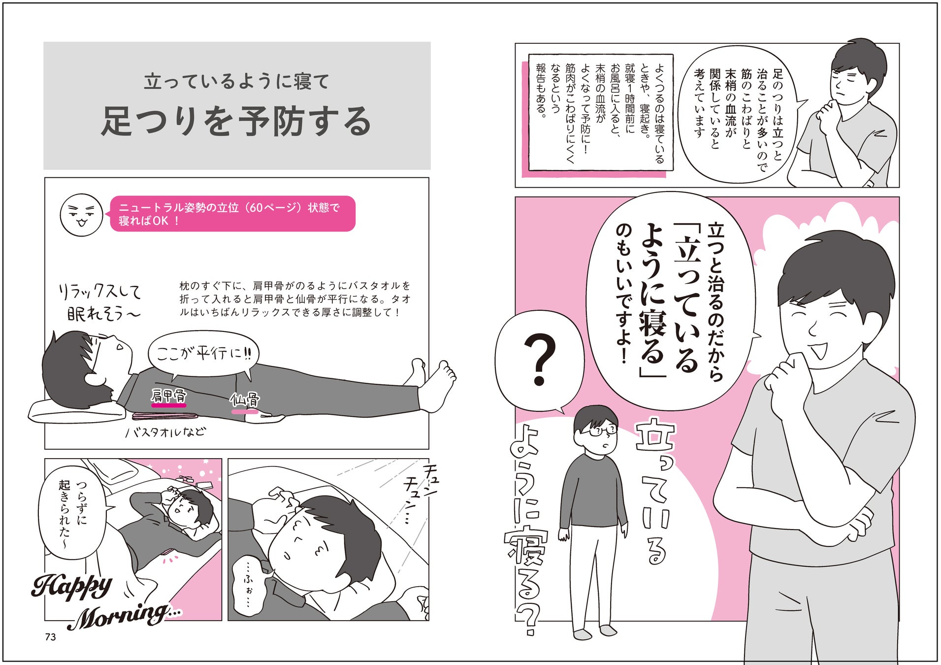 「足のつりは、立つと治ることが多いもの。筋のこわばりと抹消の血流が関係しているといわれます。就寝中に足がつりやすい人は「立っているように寝る」のがおすすめ」