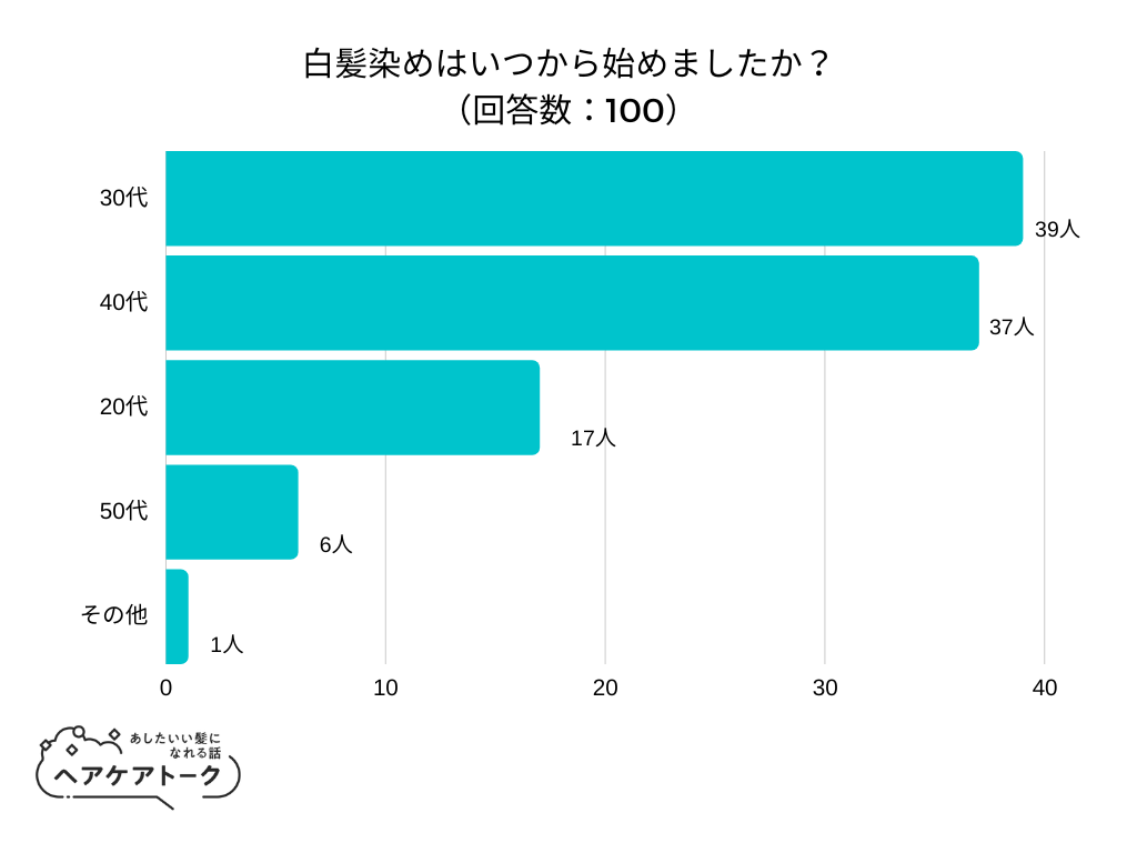 「白髪染めはいつから始めましたか?」とアンケート調査した結果、1位は『30代』でした。