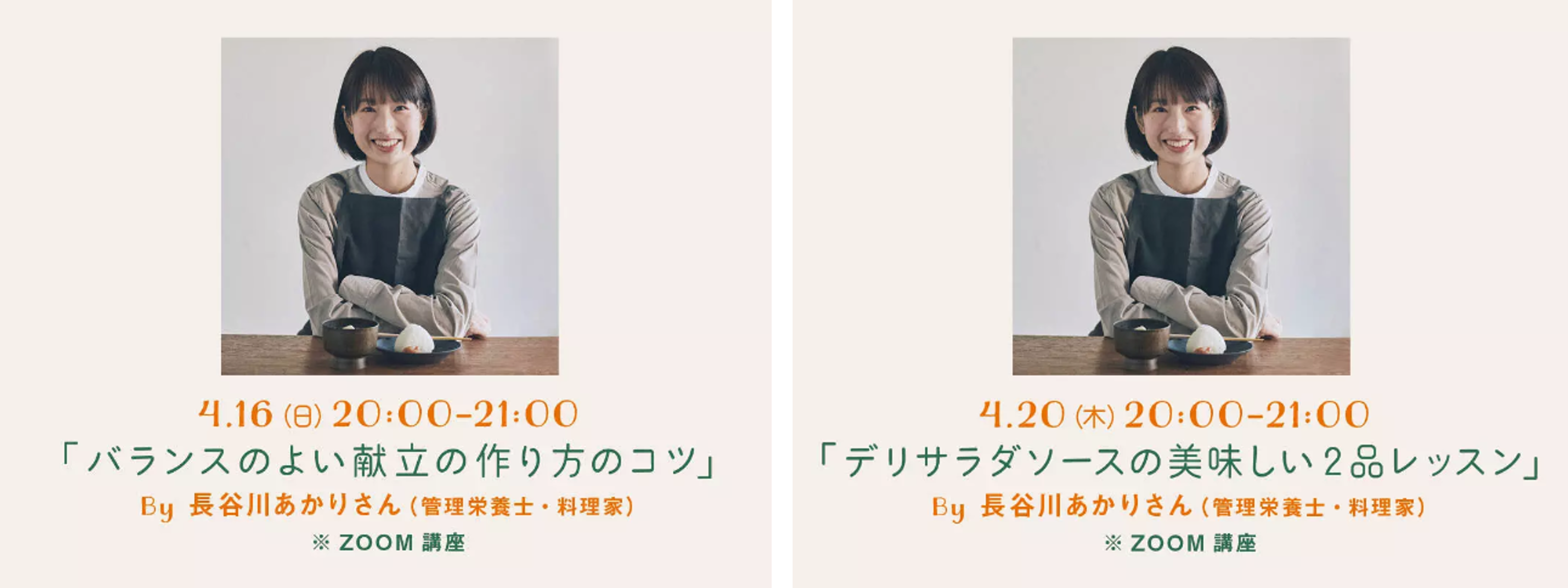 体験セットを購入いただくと『Qummy』から食材セットが届き、届いた食材を使ったレシピやバランスのよい献立のヒントを、本体験セット限定のLINEオープンチャットから毎日ご提案します。献立を考える悩みから解放され、理想的な栄養バランスが学べる1週間を体験できます。さらに期間中に、今回の献立監修を務める料理家で管理栄養士の長谷川あかりさんによるヘルシーな食べ方講座、新商品のデリサラダソース(https://qummy.kewpie.co.jp/pages/delisaladsauce)を使った簡単料理レッスン、さらに、美筋ヨガ考案者でヨガインストラクターの廣田なおさんによる優しいヨガレッスン、合わせて3つの講座をオンライン(ZOOM)で開催します。