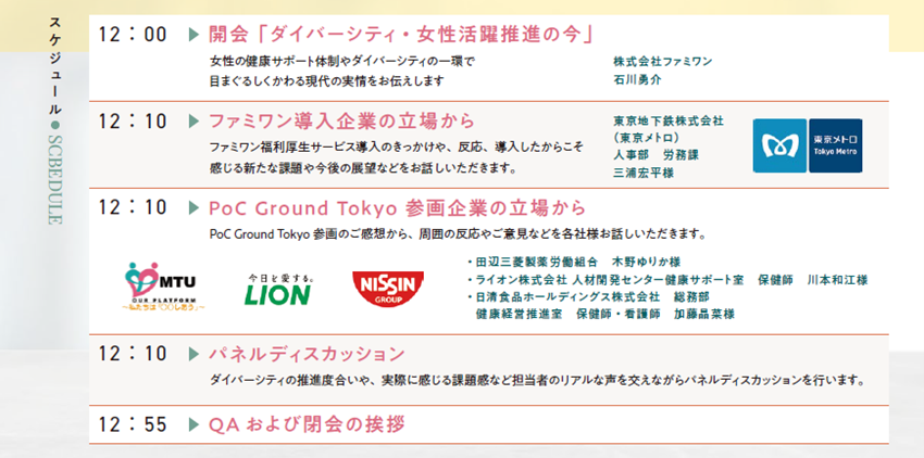 また、「東京都スタートアップ社会実装促進事業(PoC Ground Tokyo)」に採択された当社事業に参加いただいたライオン株式会社、田辺三菱製薬株式会社、日清食品ホールディングス株式会社にもご登壇いただき、PoC参加のきっかけや新たな取り組みを進めている中での率直な感想、従業員に対しての想いや今後の取り組みなどについてお話いただきます。