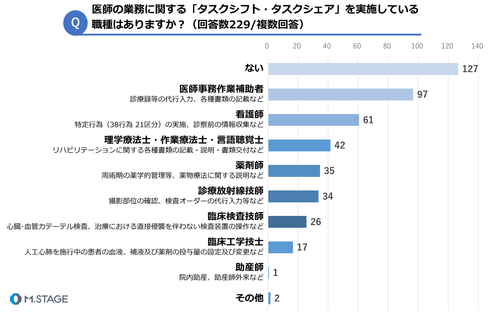 医師の業務に関する「タスクシフト・タスクシェア」を実施している職種として、診療録等の代行入力、各種書類の記録などをおこなう「医師事務作業補助者」(97)、特定行為(38行為21区分)の実施、診断前の情報収集などをおこなう「看護師」(61)、リハビリテーションに関する各種書類の記載・説明・書類交付などをおこなう「理学療法士・作業療法士・言語聴覚士」(42)が多い結果となりました。