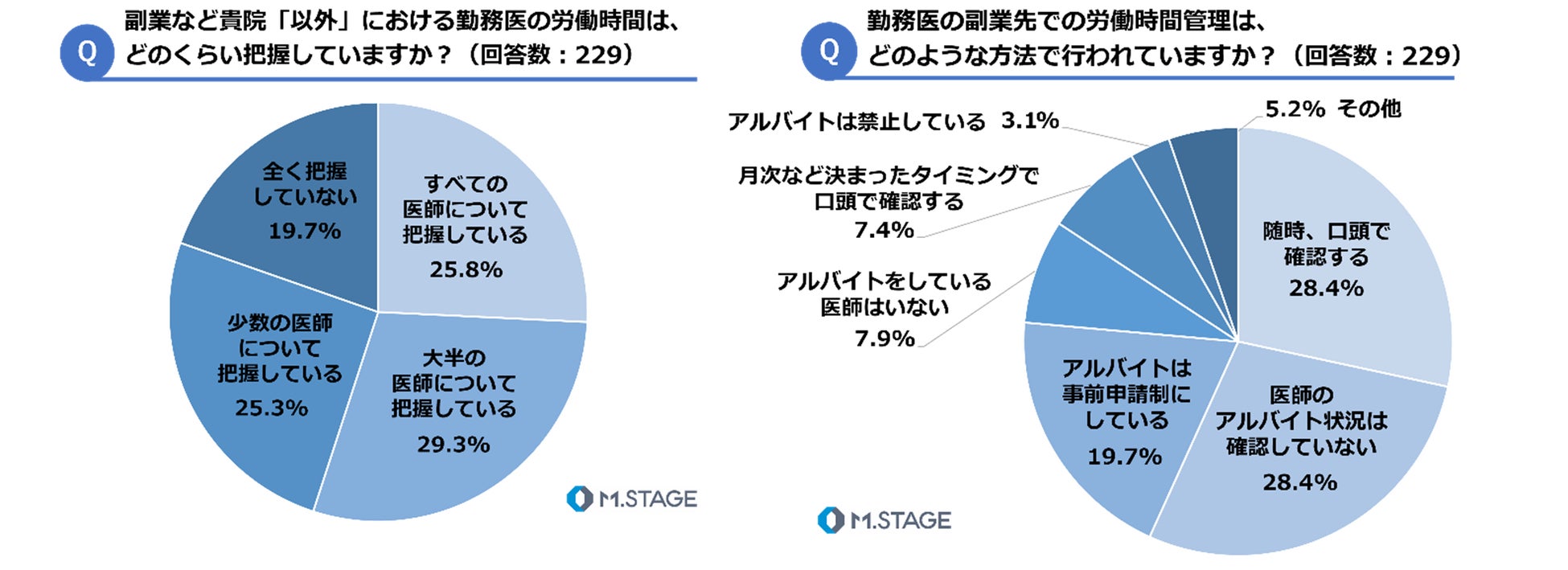 また、副業先の労働時間把握の方法としては、「随時、口頭で確認する」(28.4%)、同率で「医師のアルバイト状況は確認していない」(28.4%)となり、次いで「アルバイトは事前申請制にしている」が19.7%となりました。