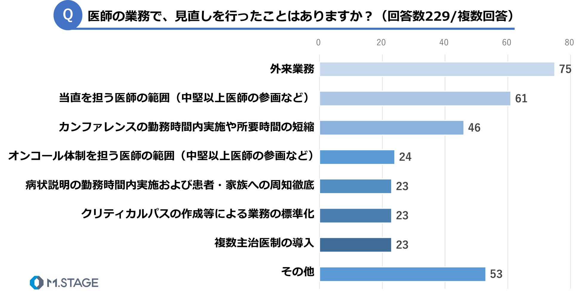 医師の業務で、見直しをおこなったこととして、「外来業務」(75)が最多となり、「当直を担う医師の範囲(中堅以上医師の参画など)」(61)、「カンファレンスの勤務時間内実施や所要時間の短縮」(46)が続きました。
