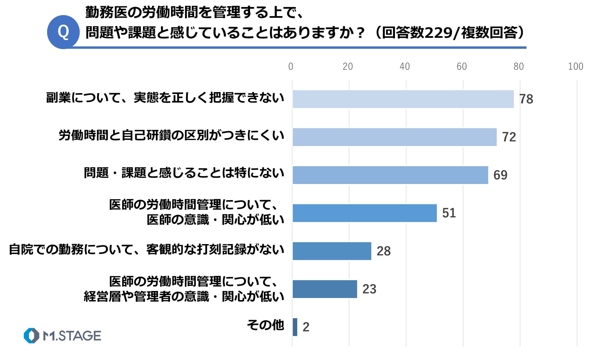 勤務医の労働時間を管理する上で、問題や課題と感じていることとして、多い順から「副業について、実態を把握できない」(78)、「労働時間と自己研鑽の区別がつきにくい」(72)、「問題・課題と感じることは特にない」(69)という結果になりました。