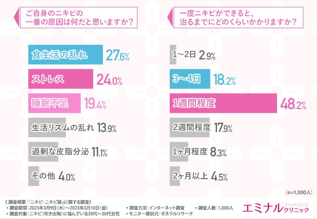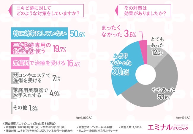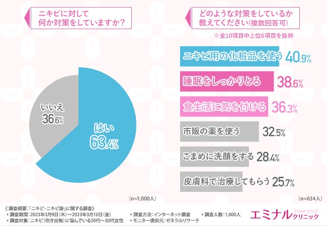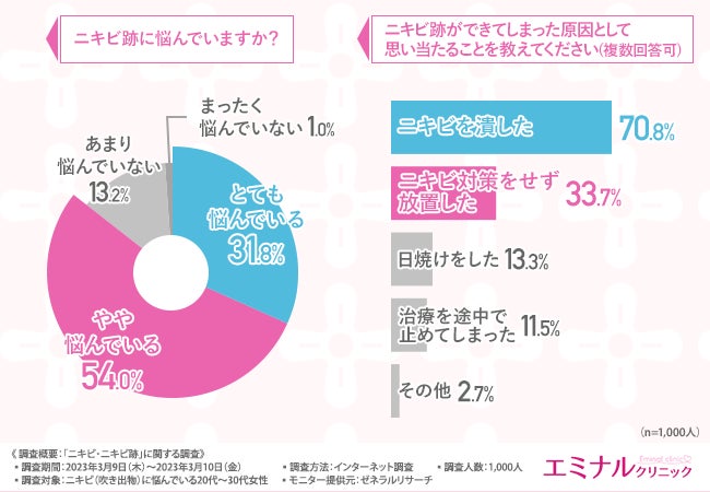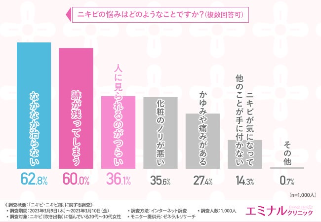 そこで今回、ダーマペン治療を手掛けるエミナルクリニックhttps://eminal-group.jp/dermapen/?refmedia=70039)は、ニキビ(吹き出物)に悩んでいる20代〜30代女性を対象に、「ニキビ・ニキビ跡」に関する調査を実施しました。