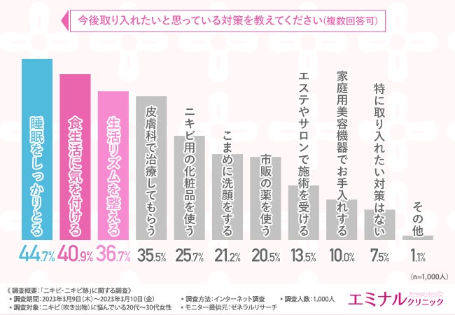 「今後取り入れたいと思っている対策を教えてください(複数回答可)」と質問したところ、『睡眠をしっかりとる(44.7%)』と回答した方が最も多く、次いで『食生活に気を付ける(40.9%)』『生活リズムを整える(36.7%)』『皮膚科で治療してもらう(35.5%)』『ニキビ用の化粧品を使う(25.7%)』と続きました。