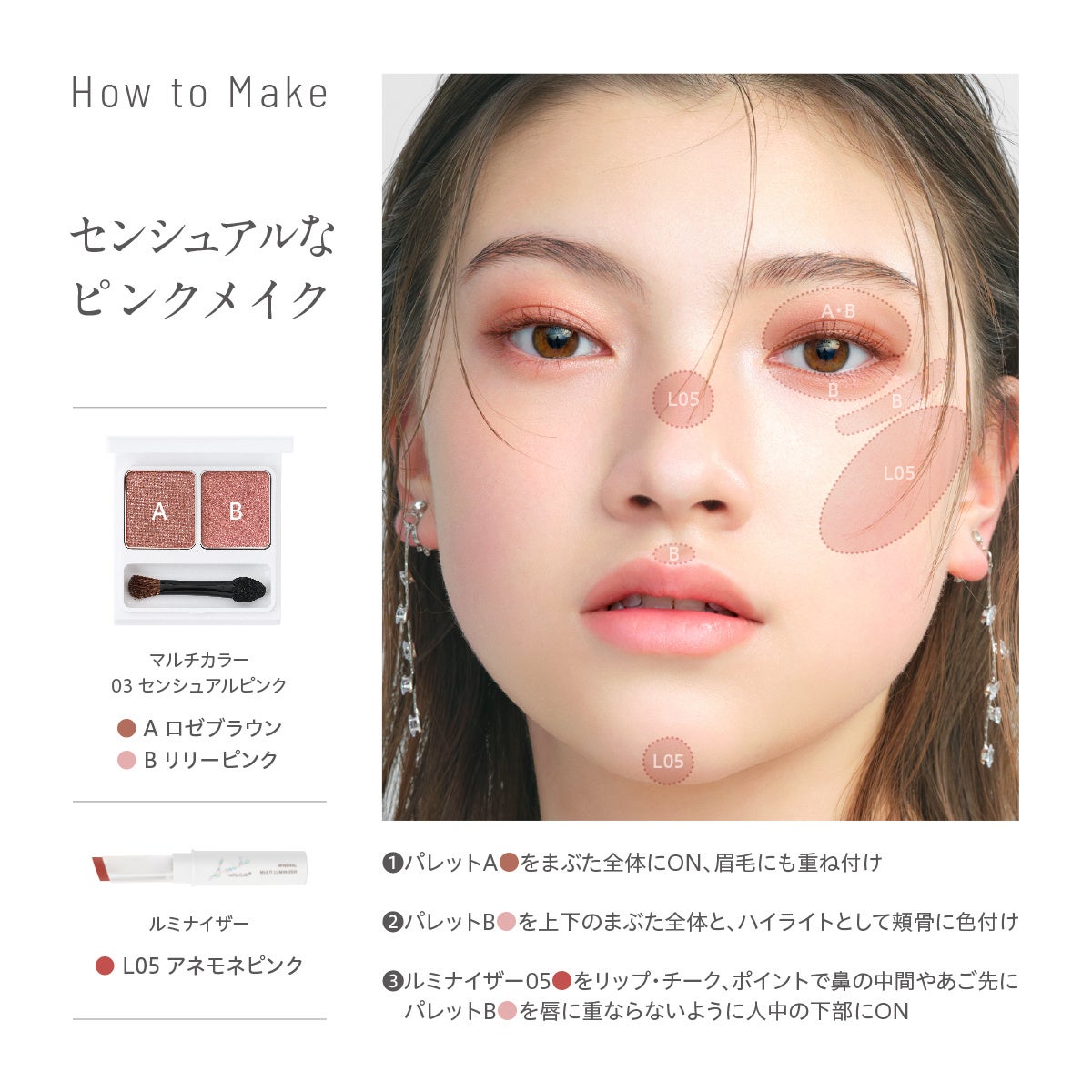 メイクアップアーティスト牧野裕大氏がカラーの選定からメイクアップ方法まで監修を行い、誰でも手軽に旬のメイクが完成します。