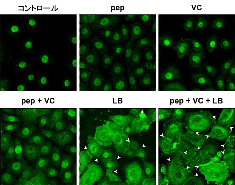 また、白色の矢印は、形成されたタイトジャンクション*2のうち、クローディン1の細胞内局在を示しています。右図が示すように、クローディン1はコラーゲンペプチドやビタミンCではコントロールとほとんど変わりませんが、レモンバームエキスのはたらきにより細胞隣接部位に分布することが分かりました。さらに、コラーゲンペプチドやビタミンCを組み合わせることで、クローディン1の細胞膜への局在がより強くなったことからも、三者の組み合わせが非常に有効であることが確認されました。