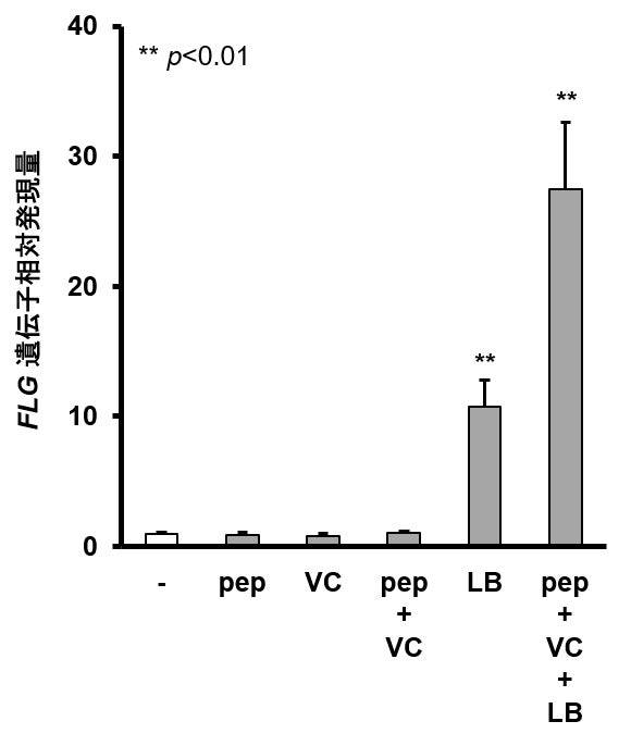 図中のpepはコラーゲンペプチド、VCはビタミンC、LBはレモンバームエキスのことをそれぞれ指しています。レモンバームエキスのみの場合でも、フィラグリン*1の遺伝子発現は10倍以上に増加します。これに加え、コラーゲンペプチドやビタミンCを組み合わせることにより、フィラグリン遺伝子はさらに発現が増加することが分かりました。