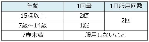●1 日2 回、1 回2 錠(15歳以上)、のみやすく小さい白い錠剤です。