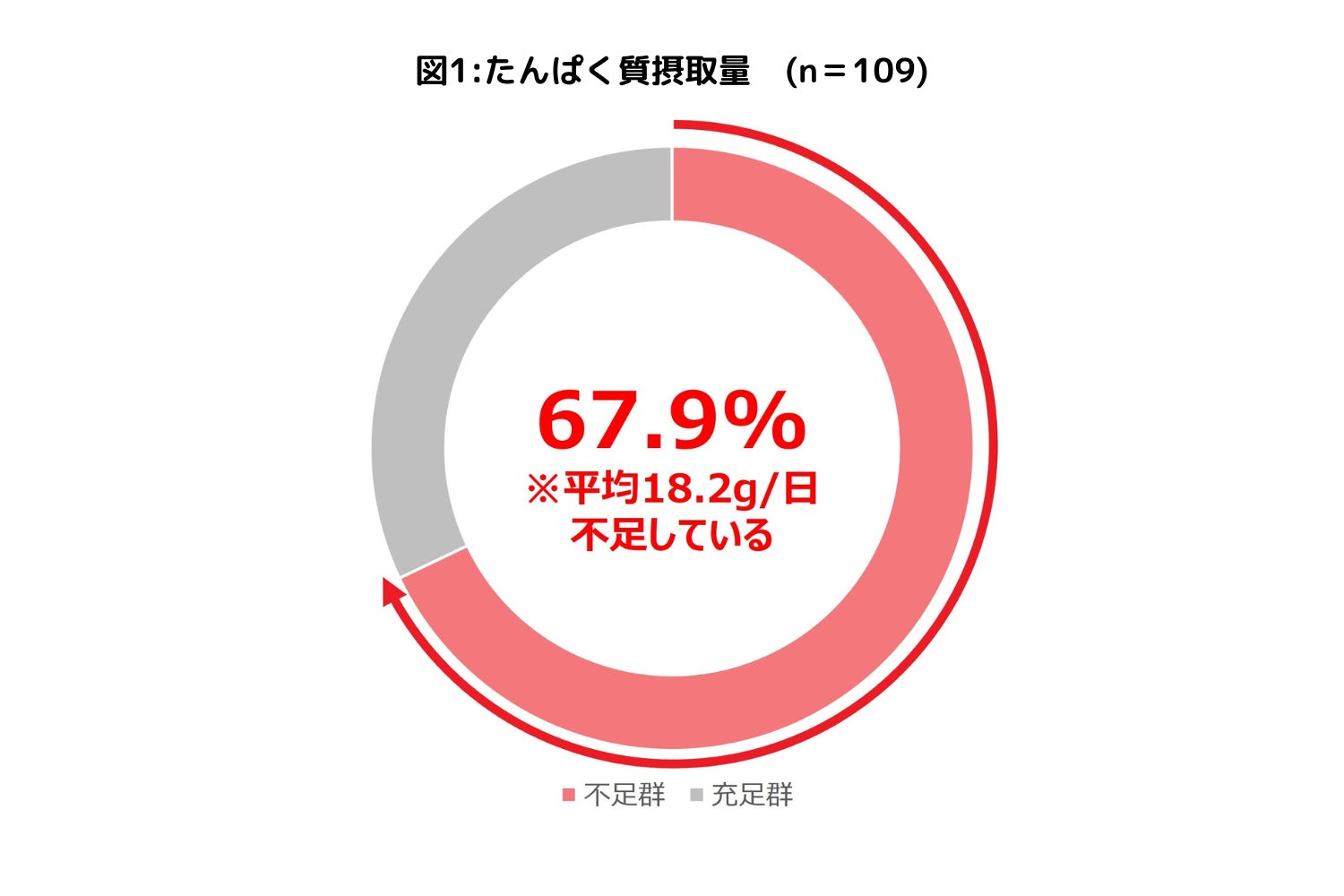 モニターの約7割はたんぱく質が不足しており、1日あたり平均18.2gのたんぱく質量が足りていない