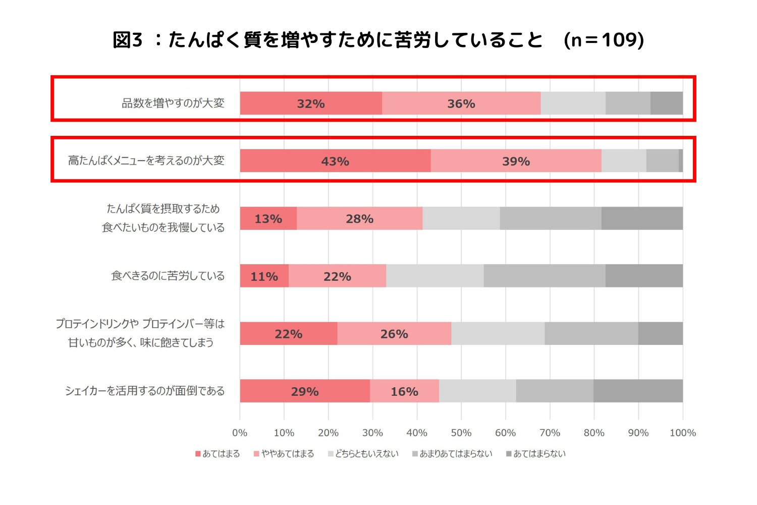 一方、「たんぱく質を増やすために苦労していることはありますか?」と聞いたところ、「品数を増やすのが大変」に対して「あてはまる」「ややあてはまる」と回答した方が約7割、「高たんぱくメニューを考えるのが大変」に対して「あてはまる」「ややあてはまる」と8割以上の方が回答しました(図3)。