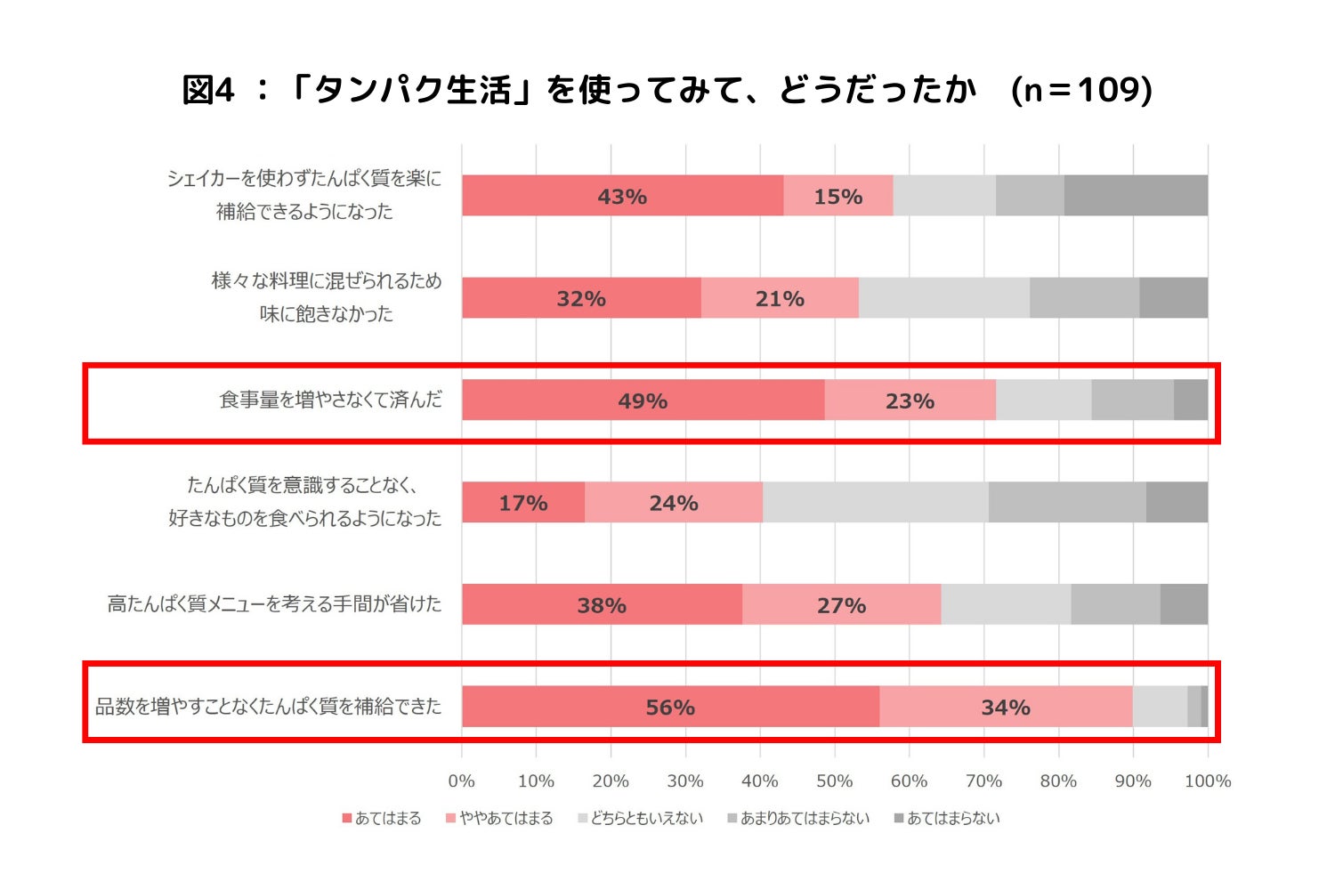 実際に商品のタンパク生活を使ってみてどうだったかの問いに対しては、「品数を増やすことなくたんぱく質を補給できた」と回答したのは約9割、「食事量を増やさなくて済んだ」が約7割だったことから、タンパク生活を使用することで“食事内容を大きく変えずにたんぱく質量を増やせた”ユーザーが多いことが明らかになりました(図4)。また、モニター期間を過ぎても週に3日以上「タンパク生活」を使用しているモニターは81%(※3)という結果