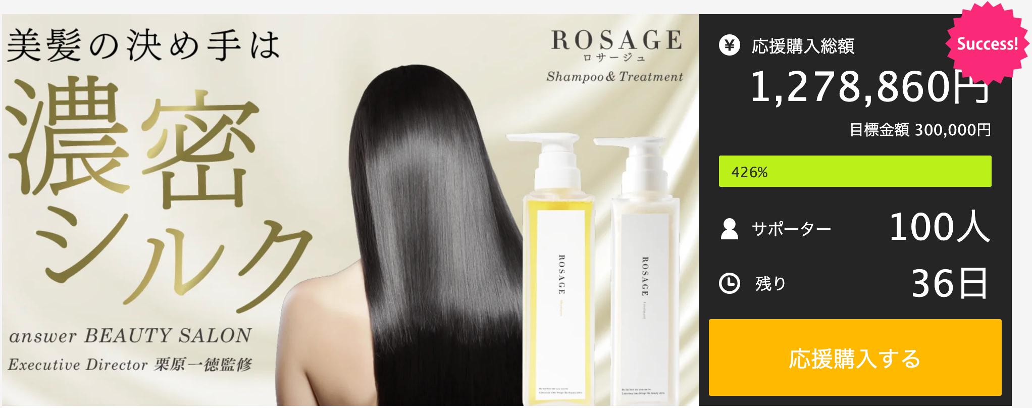 株式会社クロコ(本社:東京都中央区、代表取締役:田中貴紀)が運営する美容室「answer BEAUTY SALON」では、応援購入サービス「Makuake」で公開している「ROSAGE(ロサージュ)シャンプー&トリートメント」プロジェクトが開始2日で支援者様100名、目標金額400%を達成しました。