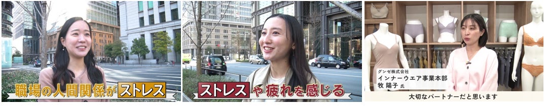 「働く女性の暮らしと下着選びに関する調査」で明らかとなった、働く女性のストレス実態、コンセプトムービーを視聴した感想を聞く街頭インタビューと、グンゼのブランド担当によるインタビューを収めた動画を3月24日(金)より公開いたします。ぜひ、こちらの動画もご視聴ください。