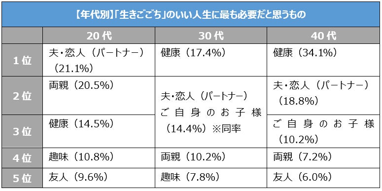 「生きごこち」のいい人生に最も必要なものは、20代はパートナーの存在がもっとも大きい結果に。