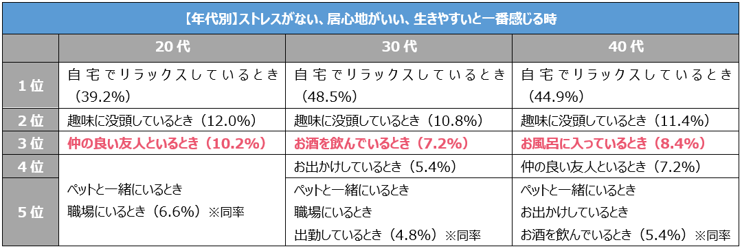 年代別で見ると、1位・2位は各世代同じでしたが、3位においては、20代では「仲の良い友人といるとき(10.2%)」、30代は「お酒を飲んでいるとき(7.2%)」、40代は「お風呂に入っているとき(8.4%)」と、異なる結果に。30、40代はじぶん時間を大切にする人が多い一方、20代は友人と過ごす時間も自分らしくいるための大切な時間として捉えているようです。