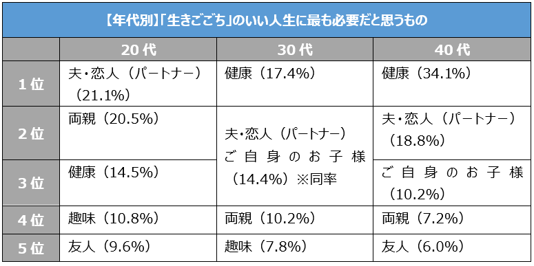「生きごこち」のいい人生に最も必要なものは、20代はパートナーの存在がもっとも大きい結果に。