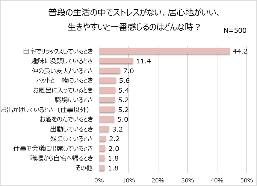 反対に、ストレスがなく居心地がいい、生きやすいと一番感じるのはどんな時かも質問しました。結果「自宅でリラックスしているとき(44.2%)」に4割以上の票が集まりました。居心地よく過ごすためには、自宅での時間が重要だと考えられます。次いで「趣味に没頭しているとき(11.4%)」という回答が続きました。