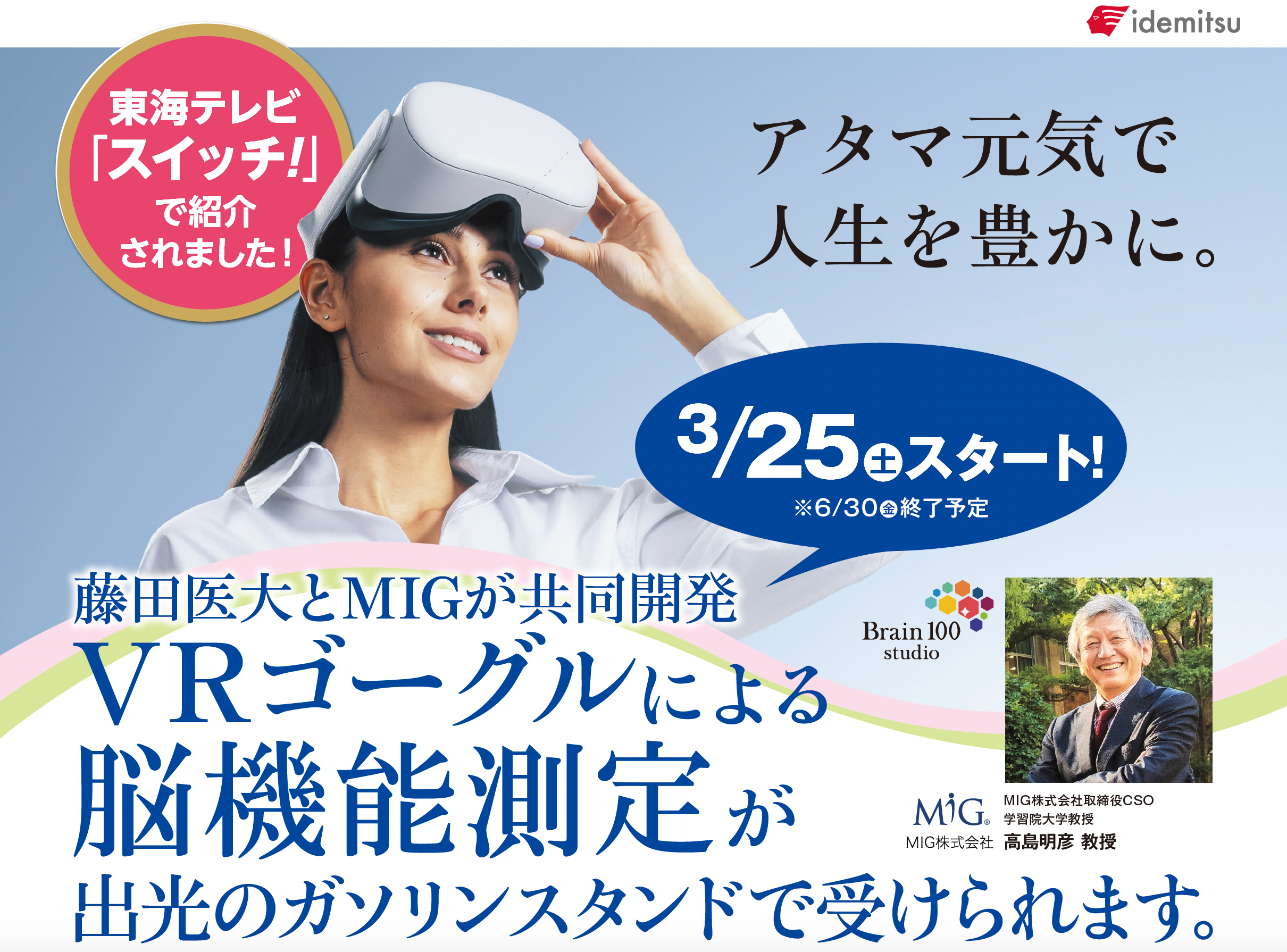 出光興産の特約販売店やサービスステーションをはじめとした事業ネットワークを、地域と人の豊かな暮らしをサポートする生活支援基地とする「スマートよろずや」の取り組みの一環として、愛知県内の3つのサービスステーションにて、3月25日(土)から期間限定で、MIGは出光興産に測定業務を委託し、VRゴーグルを用いた脳機能測定サービスを提供するものです(要事前予約、有償)。最先端の技術を用いたこの測定では、脳の認知機能の低下を最初期段階で発見することができます。