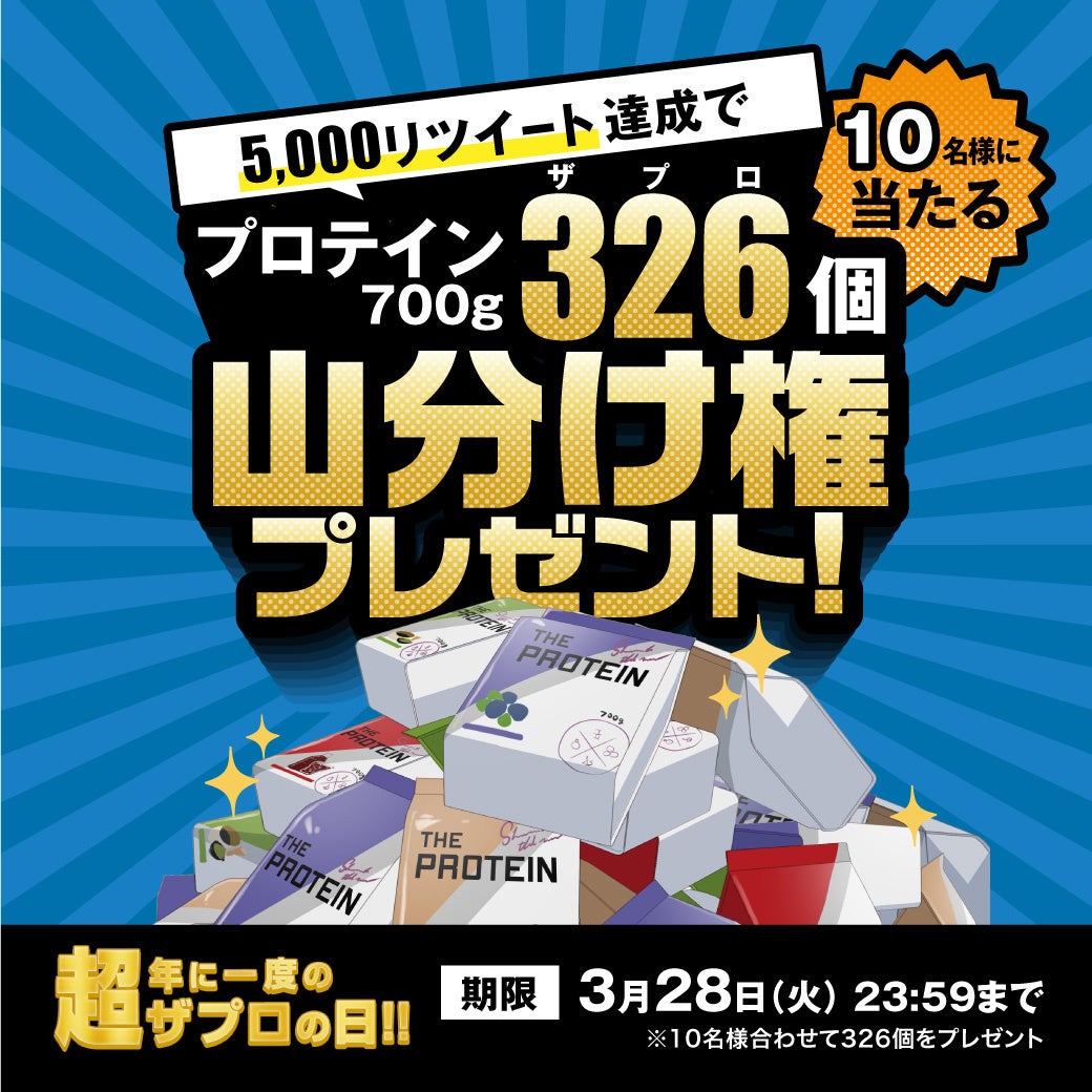 対象ツイートが5,000RTを達成すると、抽選で3名様にプロテイン(700g)、326個の山分け権を進呈します。※山分けの内訳…1等40個、2等35個(2名)、3等27個(8名)