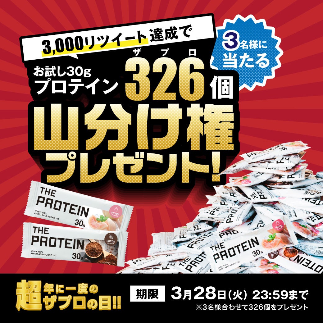 - 〈プレゼント企画①:3,000RT達成で、プロテイン個包装326個を3人で山分け!〉