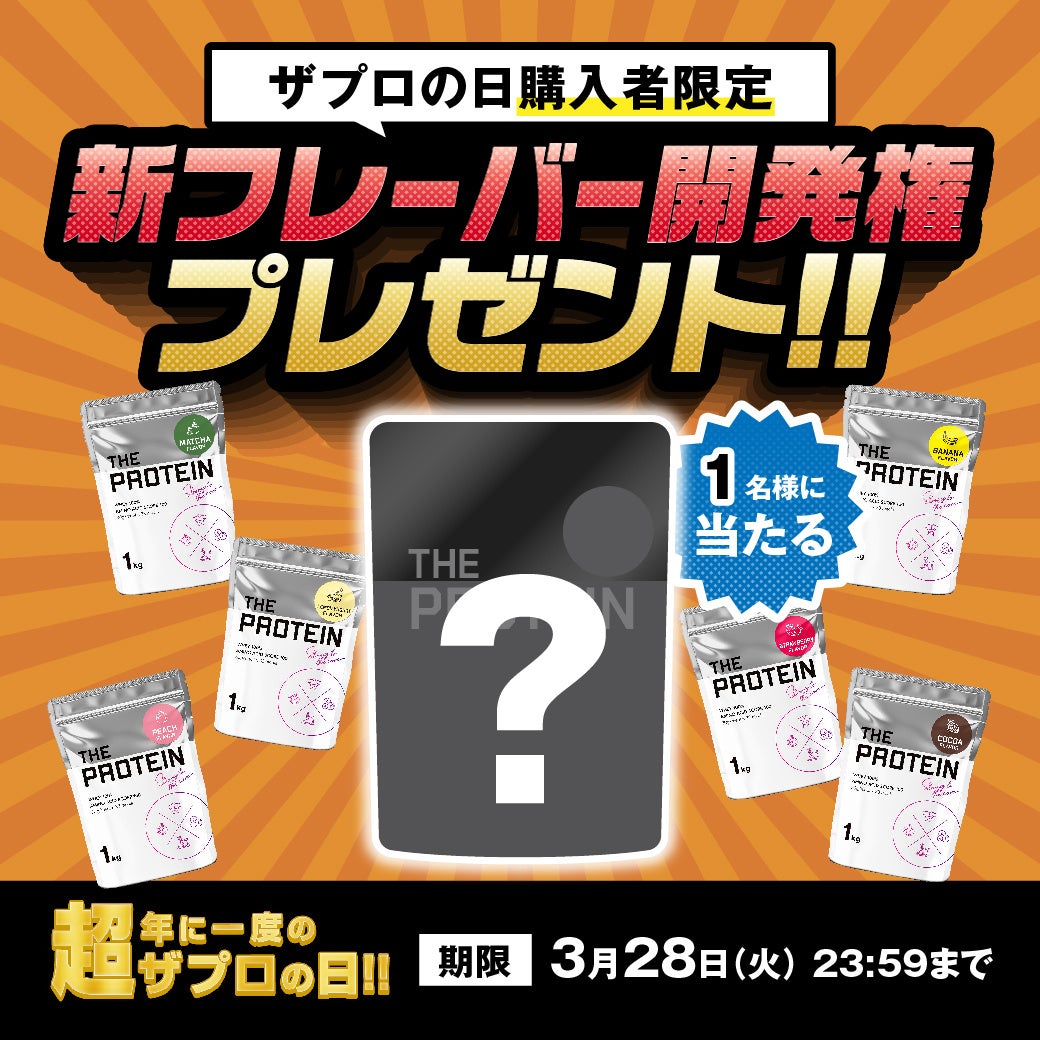 ザプロの日期間中(2023年3月26日(日)12:00~3月28日(火)23:59)に商品をご購入いただいた方の中から抽選で1名様に”プロテイン新フレーバ―開発権”をプレゼントいたします。