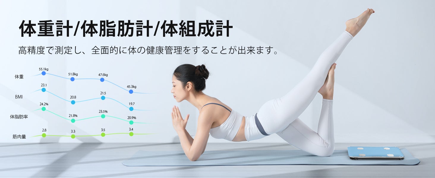 乗るだけで、体重/BMI/体脂肪率/皮下脂肪/内臓脂肪/体内水分率/骨格筋/筋肉量/推定骨量/タンパク質/基礎代謝/除脂肪体重/体年齢など13種類の健康項目がすばやく測定され、Bluetooth専用アプリでデータ自動転送&記録可能です。加えて、ユーザー登録数無制限、Samsung Health / Fitbit / Apple health / Google health と連動可能な体組成計です。