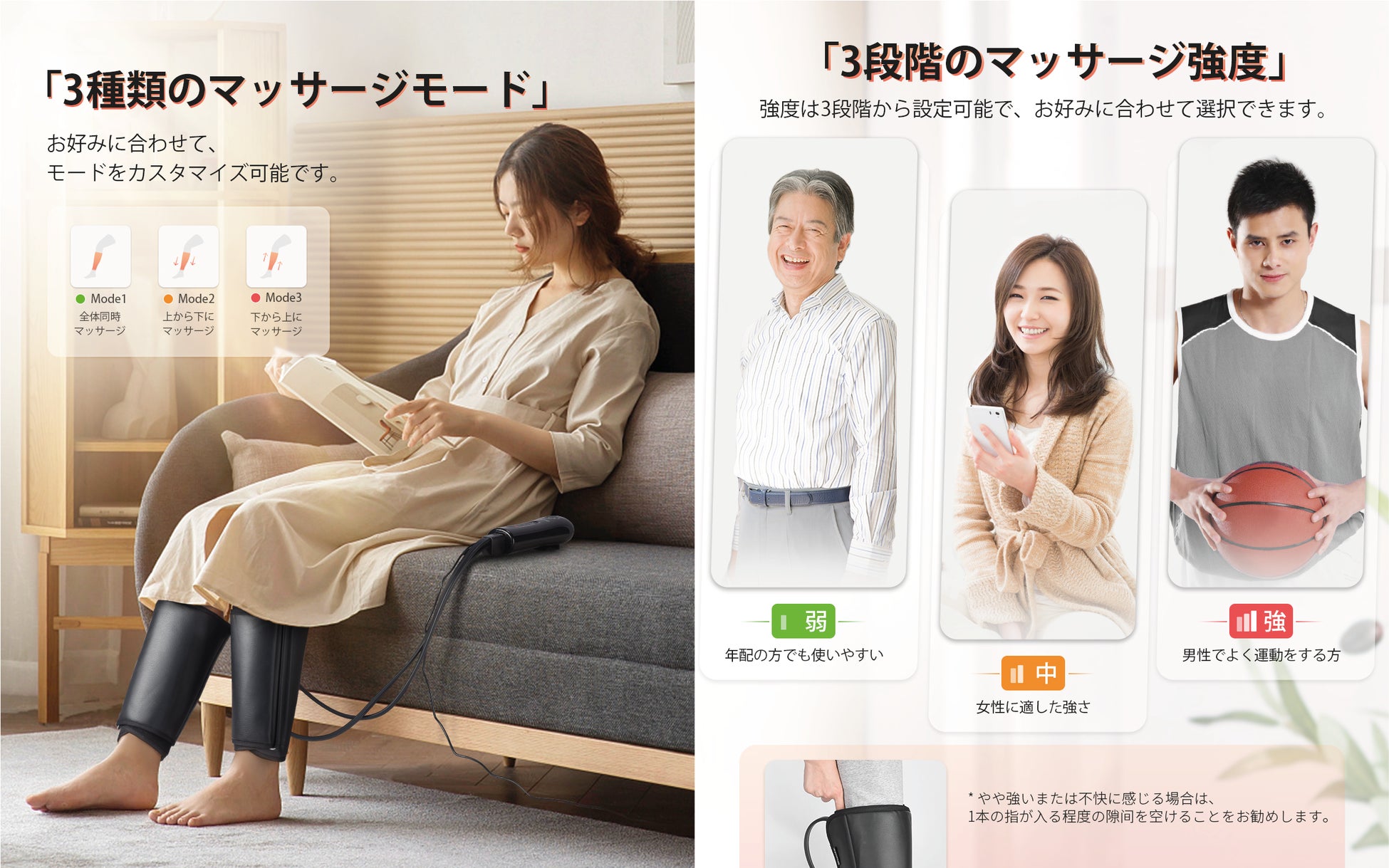 3種類のフットマッサージモードと、強中弱3つの強度レベルがあります。モードと強度を組み合わせて、お好みに合わせてご使用いただけます。モード1: 全体のマッサージ、モード2:上から下にマッサージ、モード3:下から上にマッサージです。