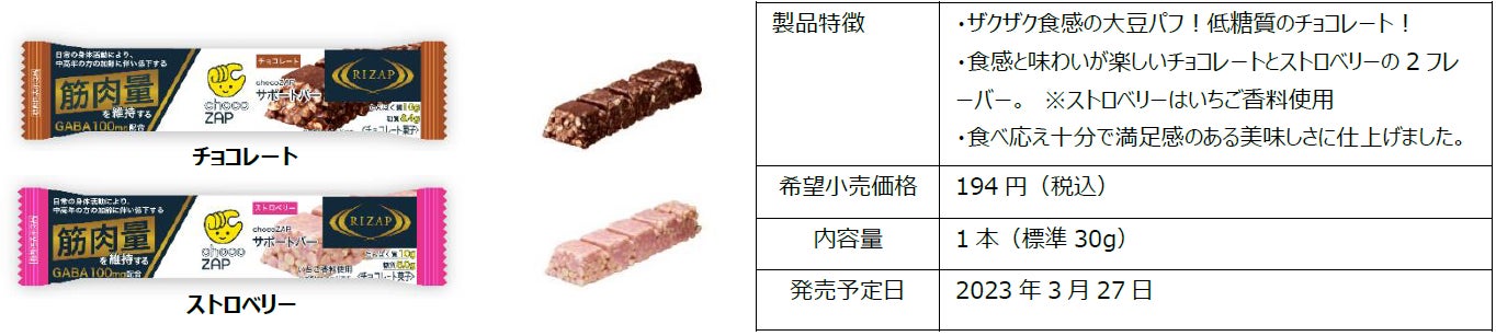 RIZAPグループ株式会社のグループ会社であるRIZAP株式会社(代表取締役社長 瀬戸 健、本社:東京都新宿区、以下「RIZAP」)は、chocoZAP(ちょこざっぷ)ブランドとして初めての機能性表示食品※1、機能性関与成分GABA100mg配合の「chocoZAPサポートバー(チョコレート菓子)」 チョコレート/ストロベリーの2種類を2023年3月27日(月)より、一部のコンビニエンスストアやドラッグストア、GMS(総合スーパー)、SM(食品スーパー)、chocoZAP店舗※2、chocoZAP ECサイト「chocoZAPオンラインストア※3」、RIZAP ECサイト「ライザップコレクション※4」にて順次販売開始することをお知らせいたします。