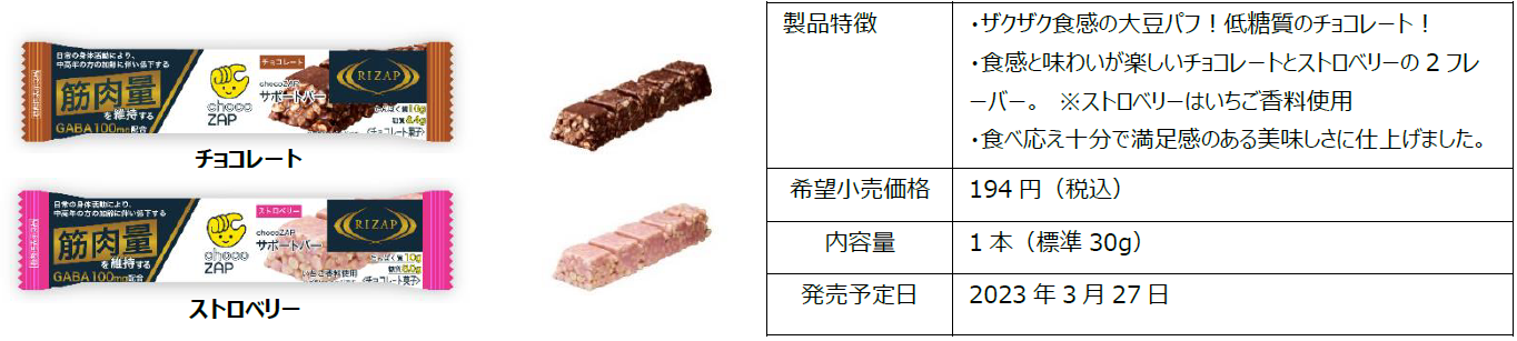 RIZAPグループ株式会社のグループ会社であるRIZAP株式会社(代表取締役社長 瀬戸 健、本社:東京都新宿区、以下「RIZAP」)は、chocoZAP(ちょこざっぷ)ブランドとして初めての機能性表示食品※1、機能性関与成分GABA100mg配合の「chocoZAPサポートバー(チョコレート菓子)」 チョコレート/ストロベリーの2種類を2023年3月27日(月)より、一部のコンビニエンスストアやドラッグストア、GMS(総合スーパー)、SM(食品スーパー)、chocoZAP店舗※2、chocoZAP ECサイト「chocoZAPオンラインストア※3」、RIZAP ECサイト「ライザップコレクション※4」にて順次販売開始することをお知らせいたします。