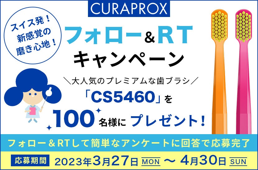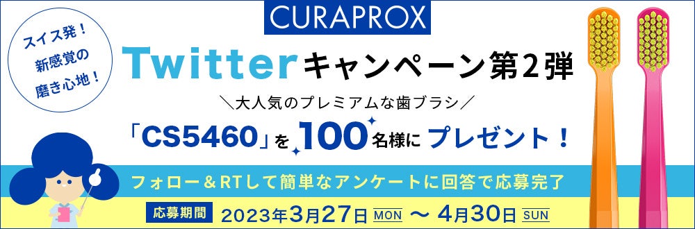 世界75カ国で支持されているスイス発の高機能歯ブラシCURAPROX (クラプロックス)を販売する株式会社クラデンジャパン(東京都台東区小島2-6-11代表取締役:池亀友、以下当社)は、Twitterで「フォロー&RTキャンペーン」を実施します。当社公式Twitterアカウント『@curaproxjapan』 をフォロー&キャンペーンツイートをリツイートして、アンケートにお答えいただいた方の中から抽選で100名様に「CS5460」をプレゼントします。「CS5460」はクラプロックス歯ブラシシリーズの中でも最も人気が高い定番のオールラウンド商品です。極上の磨き心地を一人でも多くのお客様に体験していただきたい!との思いから、本キャンペーンを実施します。