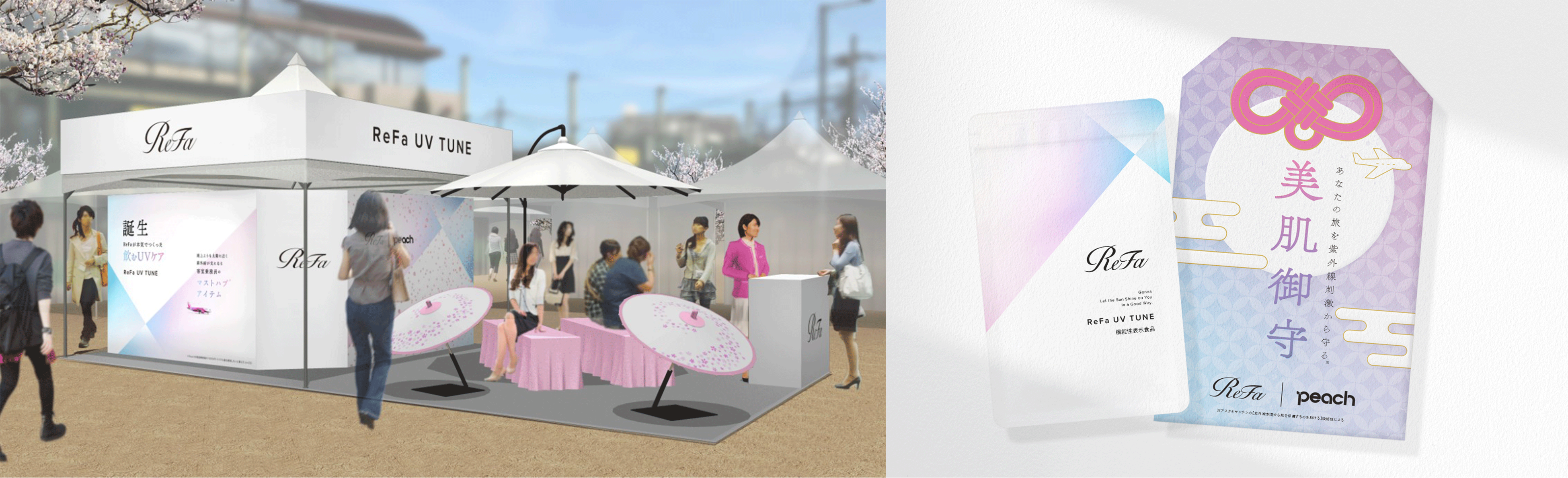 今回のキャンペーンでは紫外線が強まるこれからの季節に向けて、ReFaから発売された、大切な肌のための新しい飲むUVケア『ReFa UV TUNE』を皆さまにお試しいただくため、第1弾は4月1日(土)と4月2日(日)の2日間限定で開催される「目黒イーストエリア桜まつり」にて、第2弾は4月29日(土)より運航するPeach航空機内にて、御守りに見立てた『ReFa UV TUNE -美肌御守-』を配布します。