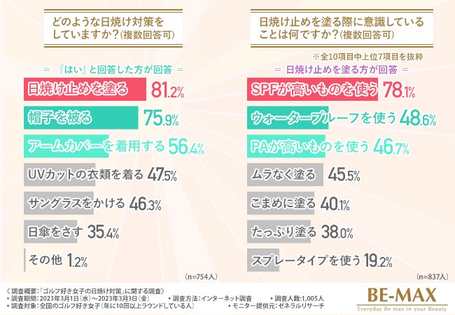 そこで今回、BE-MAX the SUN(ザ・サン) (https://www.be-max.info/)を販売する株式会社メディキューブ は、全国のゴルフ好き女子を対象に、「ゴルフ好き女子の日焼け対策」に関する調査 を実施しました。