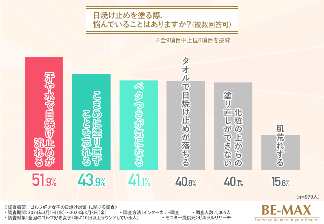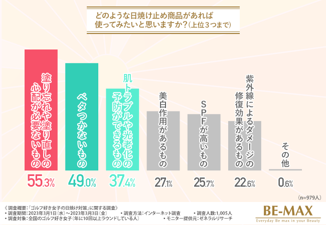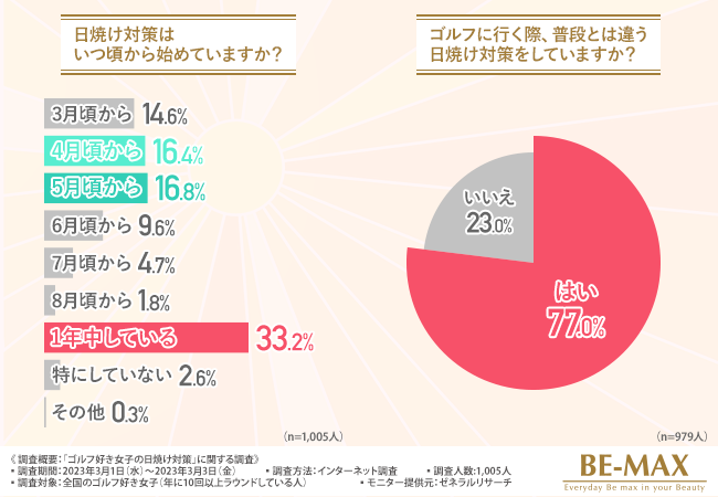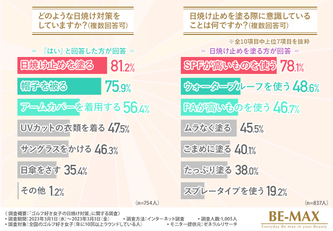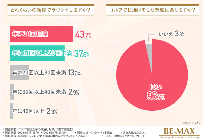 そこで今回、BE-MAX the SUN(ザ・サン) (https://www.be-max.info/)を販売する株式会社メディキューブ は、全国のゴルフ好き女子を対象に、「ゴルフ好き女子の日焼け対策」に関する調査 を実施しました。