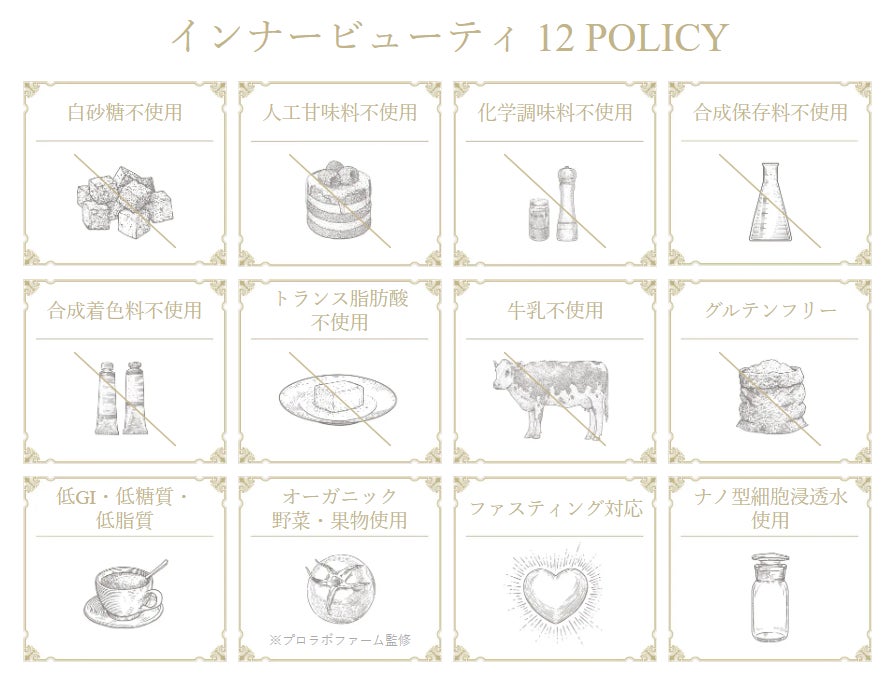 当カフェは、“安心して食べる幸せ”と“内面からの美しさ”を叶えるインナービューティカフェ&レストランとして、「低GI」「無添加」「グルテンフリー」「トランス脂肪酸フリー」「白砂糖不使用」など“インナービューティ12ポリシー”を掲げたメニューを展開。カフェで、カラダの内側から健康になれる究極のギルトフリーを実現します。