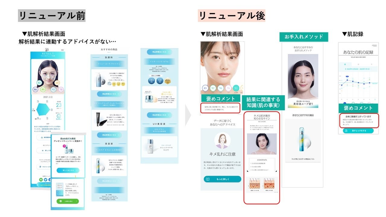 この度、今年の9月でサービスローンチから5年目を迎えるにあたり、さらなるサービスの拡充や使いやすさの進化を目指してサービスの大幅リニューアルに至りました。お客様から寄せられた声を踏まえ、必要とされる情報についてより見やすく、よりアクセスしやすいサービスの進化と、肌解析結果に応じた具体的で的確なアドバイス機能を中心に改修・開発を進めました。これからも「肌id」ではお客様の利便性とパーソナル性の向上を図りながら、頼れるスキンケアのパートナーとしてきれいをサポートしてまいります。