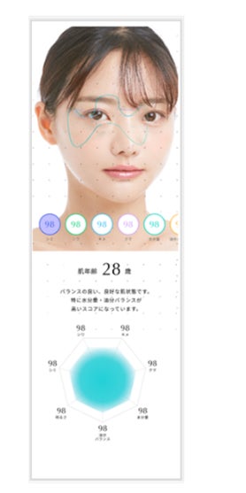 顔写真を撮影するだけで、今の肌状態を解析。肌年齢や肌状態のグレード(5段階)もわかるので、自宅で肌状態を確認することが可能。解析結果に応じて、その人に合ったアドバイスやお手入れメソッドを日々のお手入れの参考にすることができます。