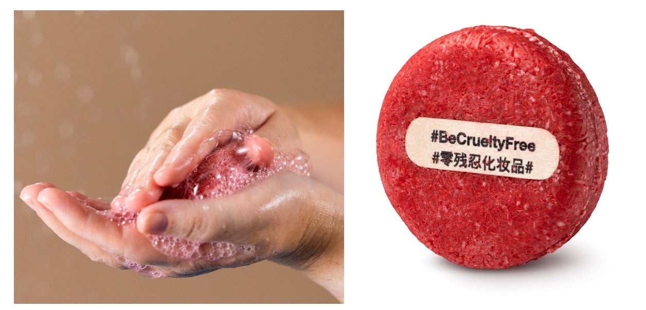 英語と中国語(簡体字)でそれぞれ「#BeCrueltyFree」、「#零殘忍化妆品#」と書かれた木製のメッセージバーを付けています。