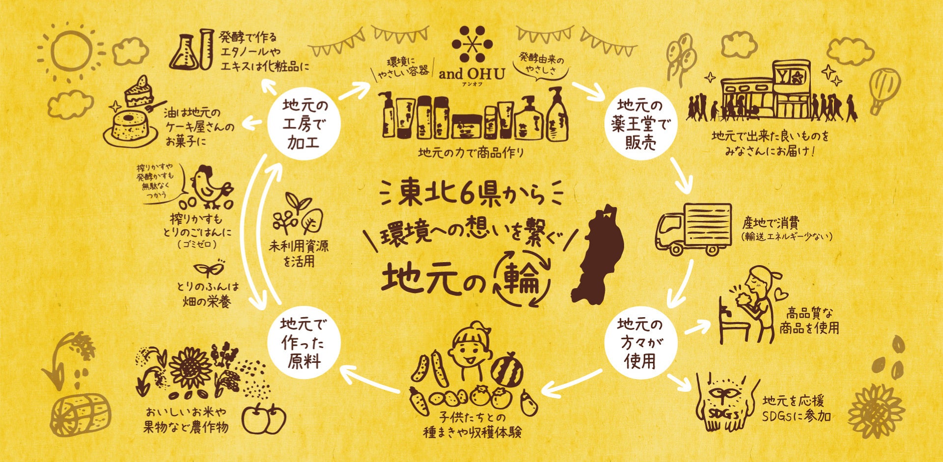 東北6県から環境への想いを繋ぐ地元の輪。薬王堂はand OHUを通じて、地元を応援して気軽にSDGs参画ができる取り組みを広げてまいりたいと考えております。