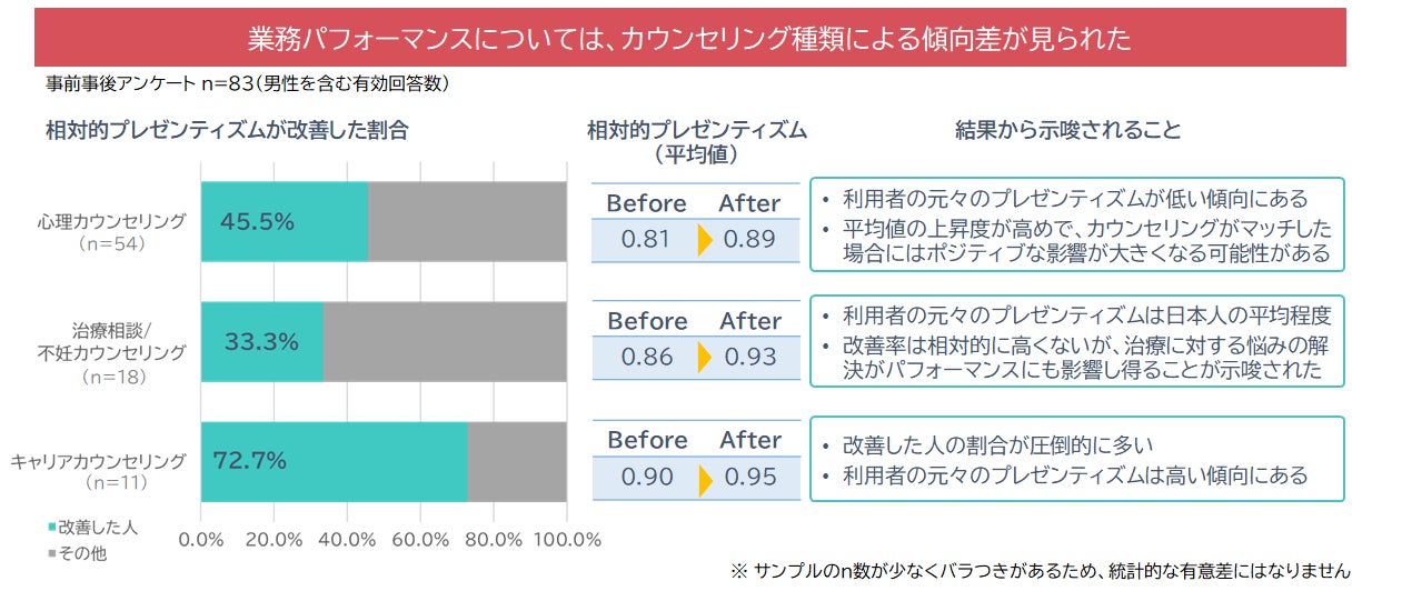 - カウンセリング種類別にプレゼンティズムが異なるかについても検証した結果、統計的有意差ではないものの傾向差が見られた。