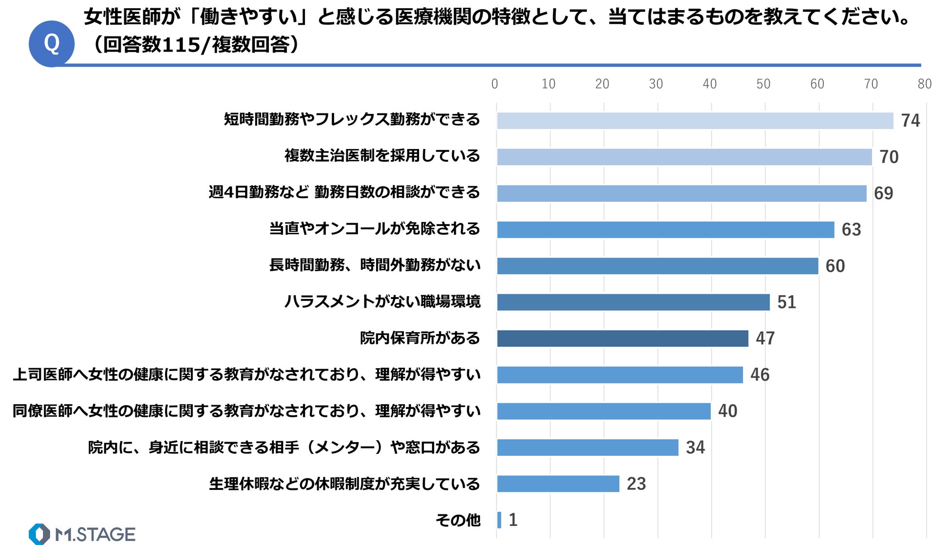女性医師が「働きやすい」と感じる医療機関の特徴として、「短時間勤務やフレックス勤務ができる」(74)が一番多く、「複数主治医制を採用している」(70)、「週4日勤務など、勤務日数の相談ができる」(69)、「当直やオンコールが免除される」(63)、「長時間勤務、時間外労働がない」(60)が続きました。