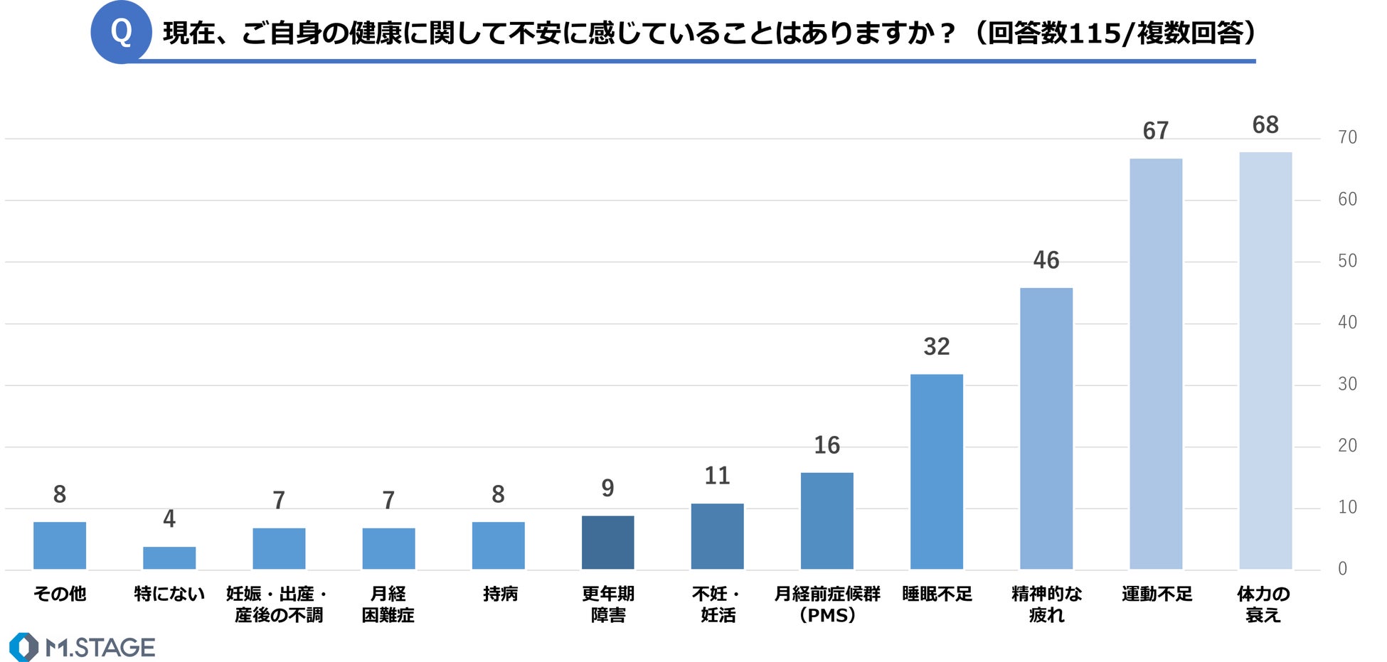 現在、自身の健康に関して不安に感じていることとして、「体力の衰え」(68)が一番多く、次いで「運動不足」(67)、「精神的な疲れ」(46)、「睡眠不足」(32)、女性特有の「月経前症候群(PMS)」(16)、「不妊・妊活」(11)が続きます。
