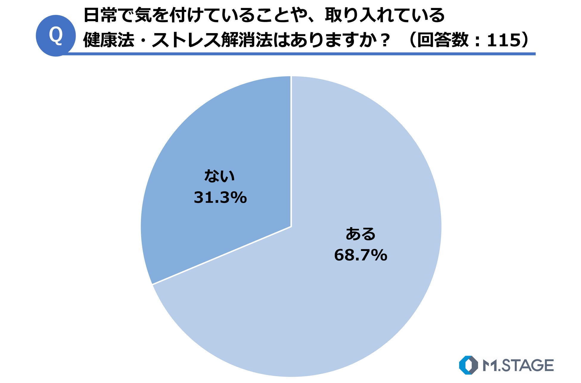 このような健康への不安に対し、日常で気を付けていることや、取り入れている健康法・ストレス解消法が「ある」という回答は約7割となり、多くの女性医師が独自の健康法・ストレス解消法を持つことがわかりました。