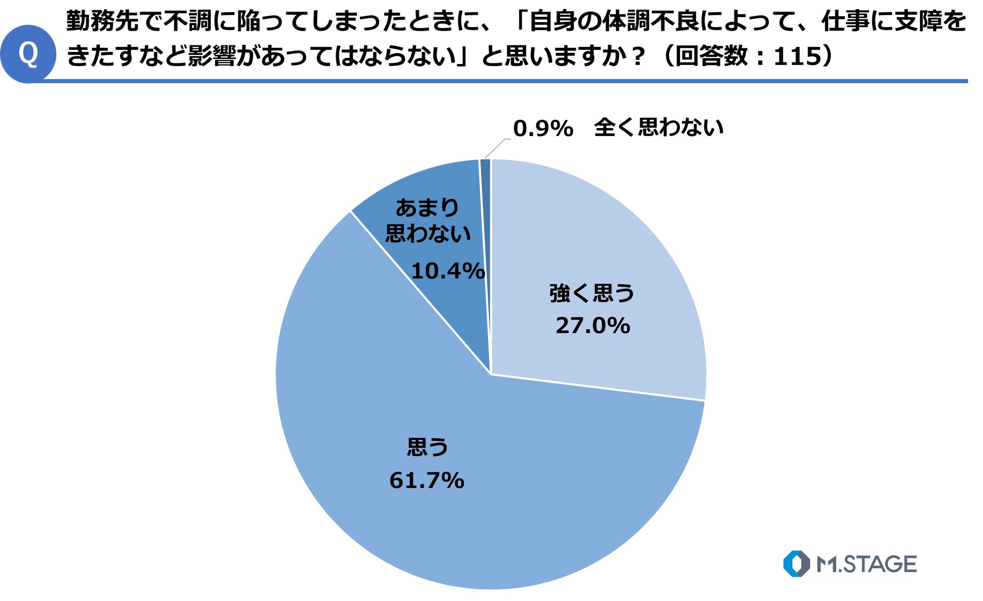 勤務先で不調に陥ってしまったとき、「自身の体調不良によって、仕事に支障をきたすなど影響があってはならない」と思う女性医師は約9割にも及び、多くが自身の体調不良による仕事への影響を「あってはならない」と感じていることがわかりました。