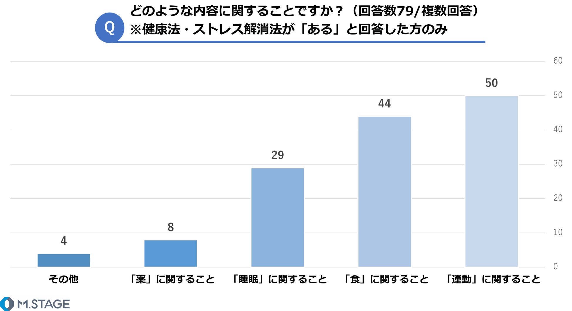 自身の健康法やストレス解消法として、半数以上が「運動」や「食」に関することと回答。
