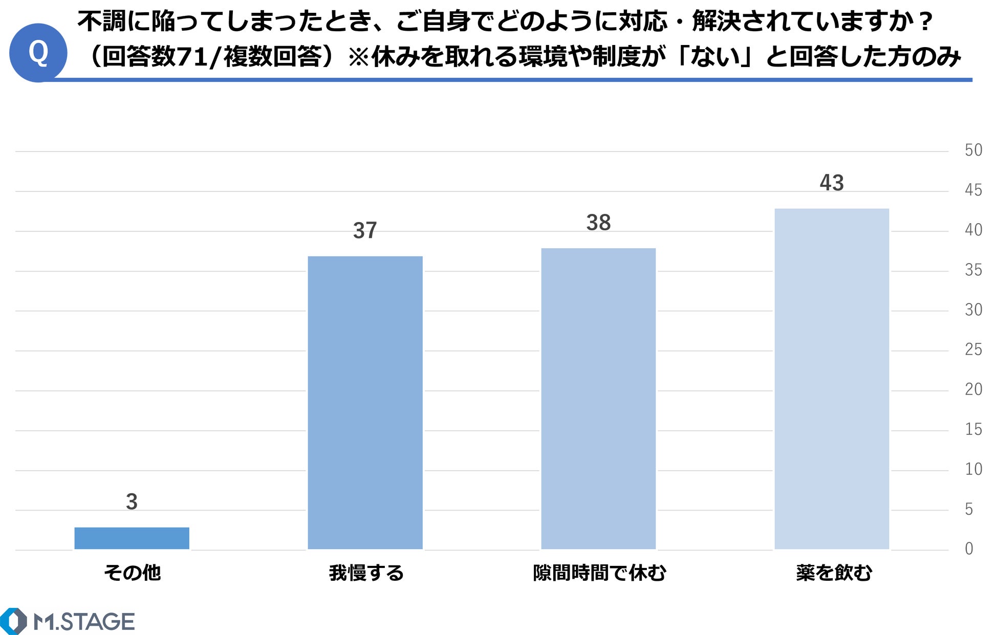 勤務先で不調に陥ってしまった際に、休みを取れる環境や制度が「ある」と回答したのは38.3%、「ない」と回答したのは61.7%となり、約6割の女性医師は不調の際に休みを取れる環境にないことがわかりました。そのような環境下のなかで不調に陥った際の対処法は「薬を飲む」(43)、「隙間時間で休む」(38)、「我慢する」(37)となりました。