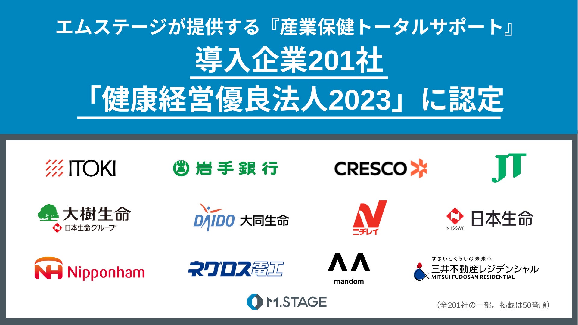事業場向け産業保健支援、医療人材総合サービスを提供する株式会社エムステージ(本社:東京都品川区、代表取締役:杉田雄二)は、当社が提供する『産業保健トータルサポート』導入企業のうち201社が「健康経営優良法人2023」に認定されたことをお知らせいたします。